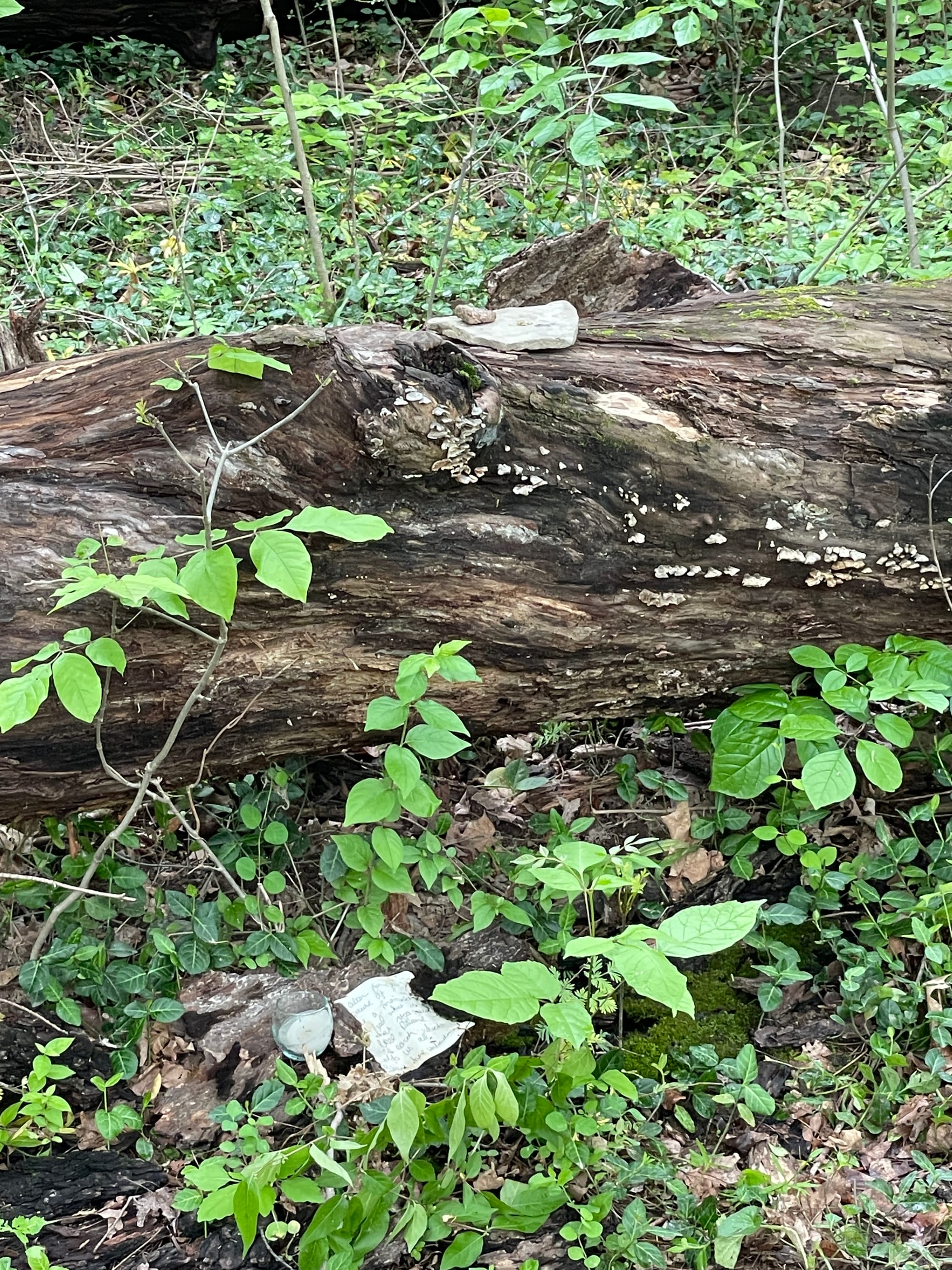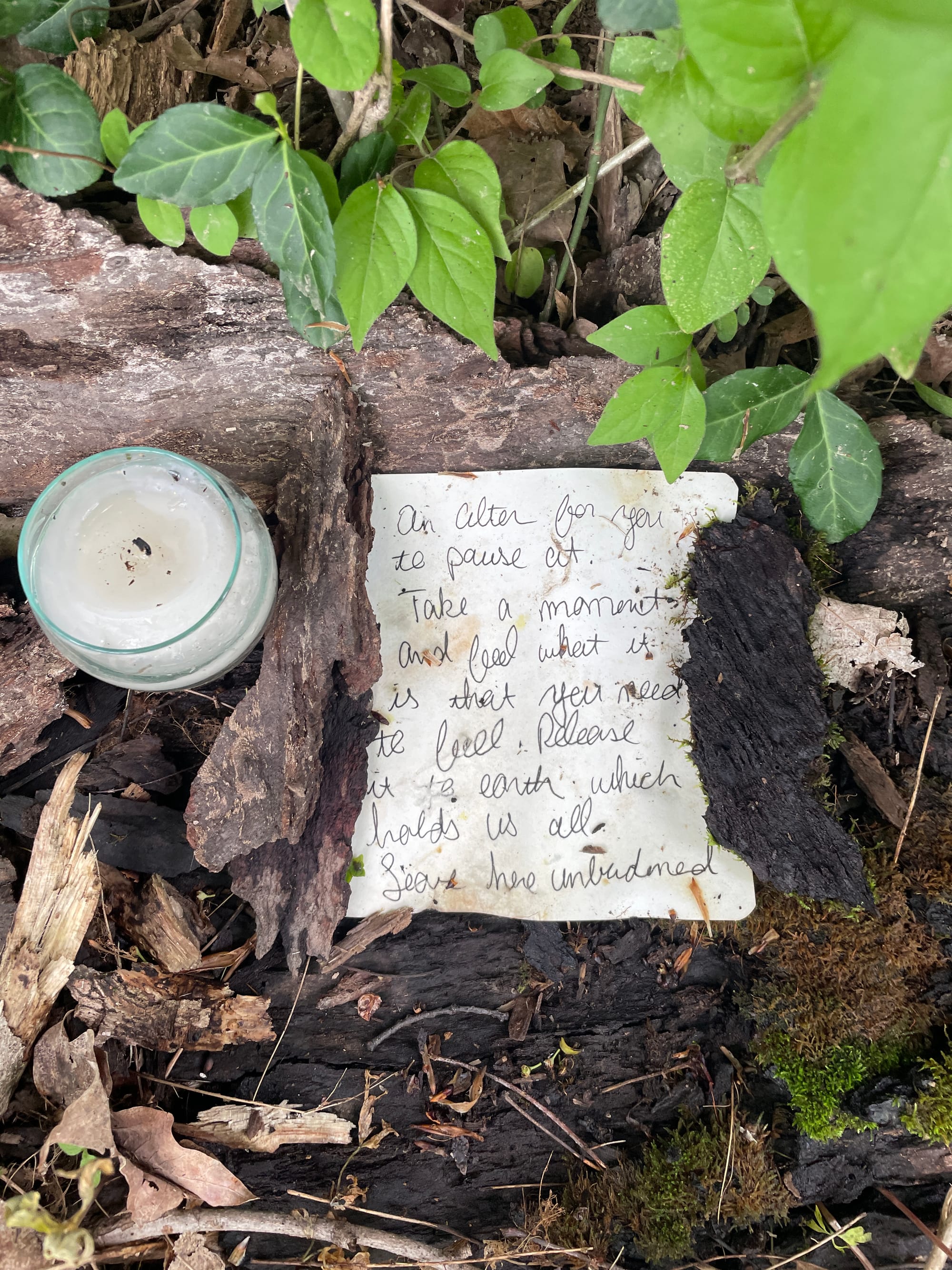 That day, I left a large flat stone I’d found nearby on top of the fallen tree. On top of that I placed a fossil from the creek and a small pile of cannabis. I lit a tea candle I’d brought from home and tried to say what was in my heart.